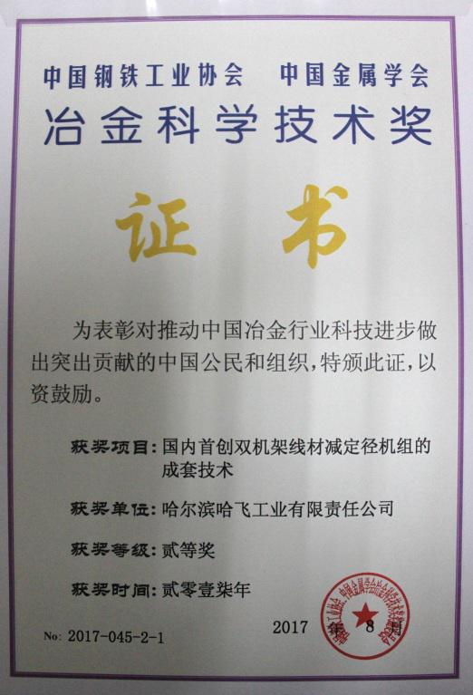 為表彰對(duì)推動(dòng)中國冶金行業(yè)科技進(jìn)步做出的突出貢獻(xiàn),冶金科學(xué)技術(shù)獎(jiǎng)獎(jiǎng)勵(lì)委員會(huì)決定對(duì)78個(gè)項(xiàng)目授予2017年中國鋼鐵工業(yè)協(xié)會(huì)、中國金屬學(xué)會(huì)冶金科學(xué)技術(shù)獎(jiǎng),我公司“國內(nèi)首創(chuàng)雙機(jī)架線材減定徑機(jī)組的成套技術(shù)”獲得二等獎(jiǎng)。我公司是冶金系統(tǒng)外的冶金設(shè)備制造商獲得此獎(jiǎng)項(xiàng),標(biāo)志雙機(jī)架線材減定徑機(jī)組成套技術(shù)對(duì)中國冶金行業(yè)科技創(chuàng)新、技術(shù)進(jìn)步有重要意義。